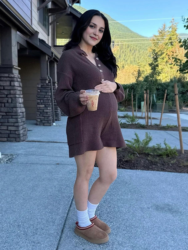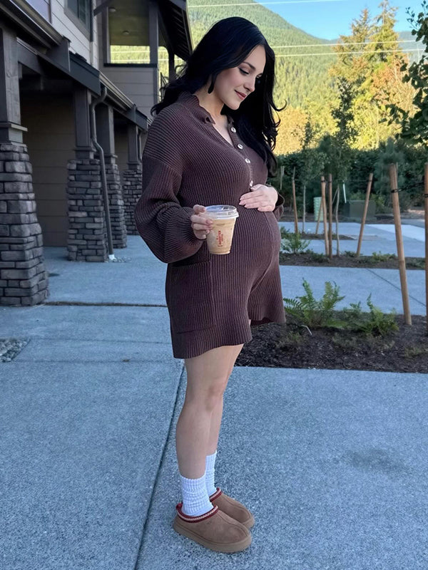 Mumsmode Zwangerchaps Dagelijks Jumpsuit Knoopjes Zakken Omgeslagen Kraag Bruin