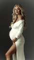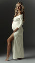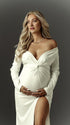 Mumsmode Zwangerchaps Maxi Fotoshoot Jurken Elegant Gekreukt Zijsplit Diep decolleté Lange Mouw Wit