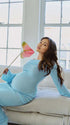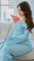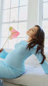 Mumsmode Zwangerchaps Maxi Fotoshoot Jurken Gekreukt Flare Mouw Boot Nek Lichtblauw