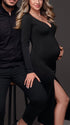Mumsmode Zwangerchaps Midi Fotoshoot Jurken Elegant Zijsplit V-hals Zwarta