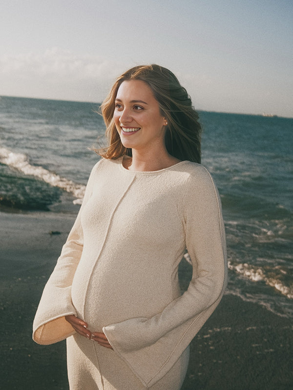 Meet met een zacht meetlint vanaf de naad van het hoogste punt van je schouder & tot aan je zij. De lengte van het kledingstuk wordt gemeten tot aan de zoom.