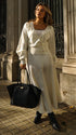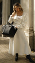 Meet met een zacht meetlint vanaf de naad van het hoogste punt van je schouder & tot aan je zij. De lengte van het kledingstuk wordt gemeten tot aan de zoom.
