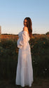 Meet met een zacht meetlint vanaf de naad van het hoogste punt van je schouder & tot aan je zij. De lengte van het kledingstuk wordt gemeten tot aan de zoom.